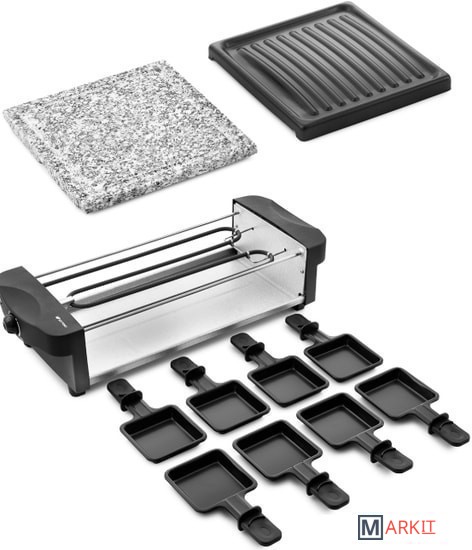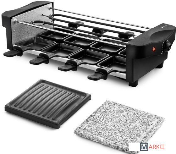 | Комплектация | Раклетница - 1 штКаменная плита - 1 штПанель с антипригарным покрытием - 1 штПорционные сковородки с антипригарным покрытием — 8 шт.Руководство по эксплуатации - 1 штГарантийный талон - 1 шт |